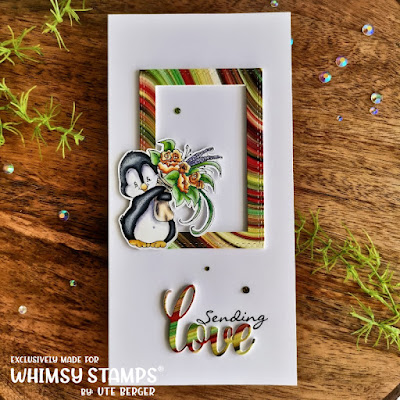 I have colored the penguin with my Triblend and partly with their Chameleon markers. These are very different than I'm used to, but it was a lot of fun. I cut out the penguin afterwards. Well, at first I wasn't sure what to make for a card. But when I picked up the paper from Whimsy, I saw that one of them has almost the same color scheme. Then I thought, it sure would be cool if I used these together. To use the paper subtly, I created a frame with the die. On top of these I placed the penguin. I really liked this because it also allowed me to choose a larger sentiment. While looking for the right sentiment I came across Sending Love, but I wanted to use a die cut. So I stamped only the sending and masked the love. Then I die cut the love from the scrap paper.Finally, I added a few gem's to the card.